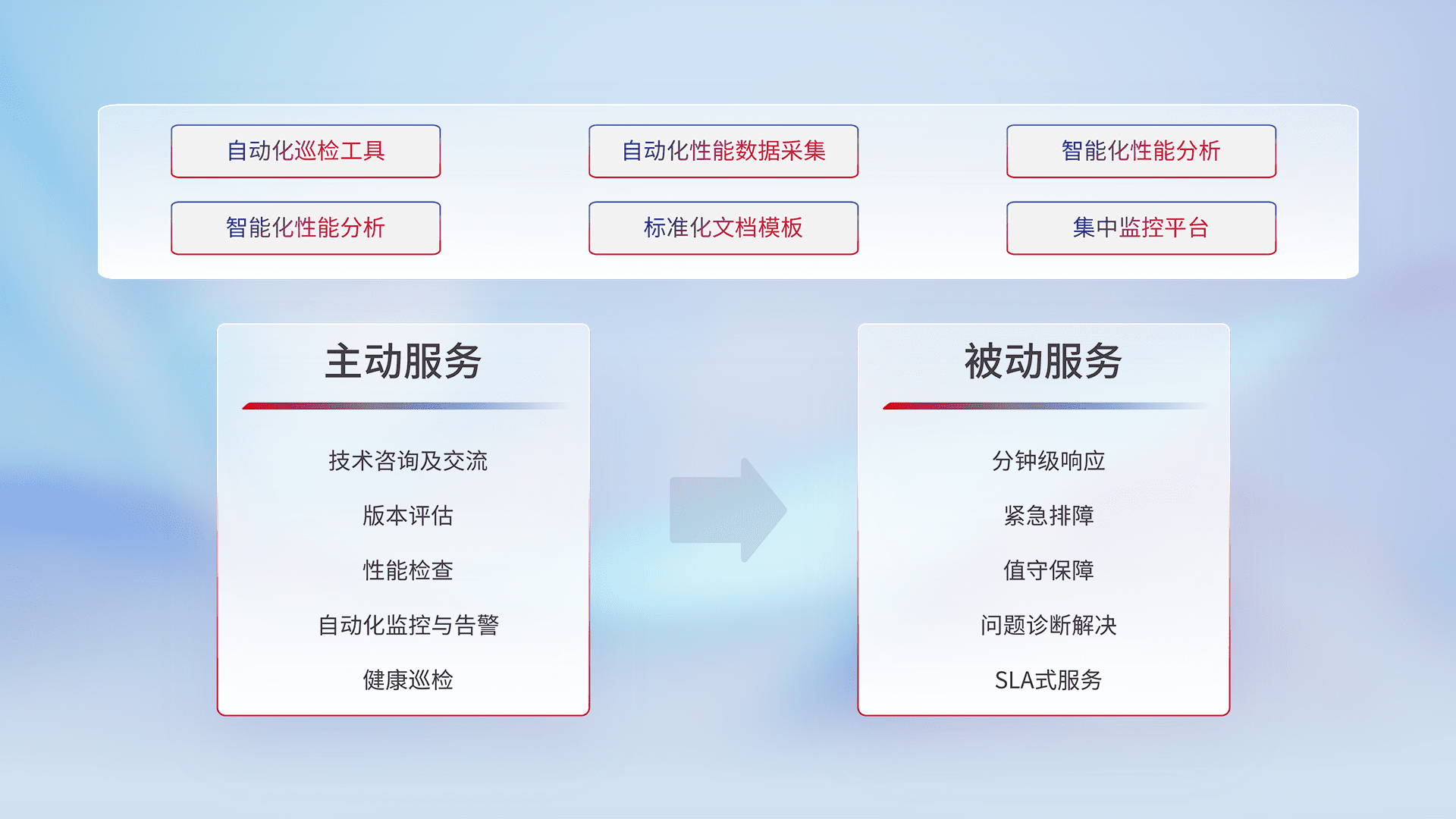 智能化工具和标准化文档,,保障服务质量,,提供主动服务(包含技术咨询、、、版本评估、、性能检查、、自动化监控与告警、、、健康巡检)和被动服务包含(分钟级响应、、紧急排障、、、值守保障、、、、问题诊断解决、、、、SLA服务)。。。